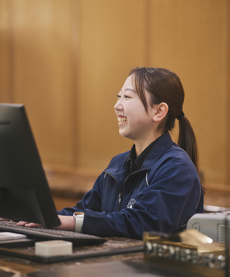 主にフロントでの受付を行い、チェックインやチェックアウト、予約確認、精算業務などを担当しています。いろんな国や年齢層のお客様が来られるので、言葉遣いや説明など、わかりやすいように気を付けながら、笑顔での接客を心がけています。