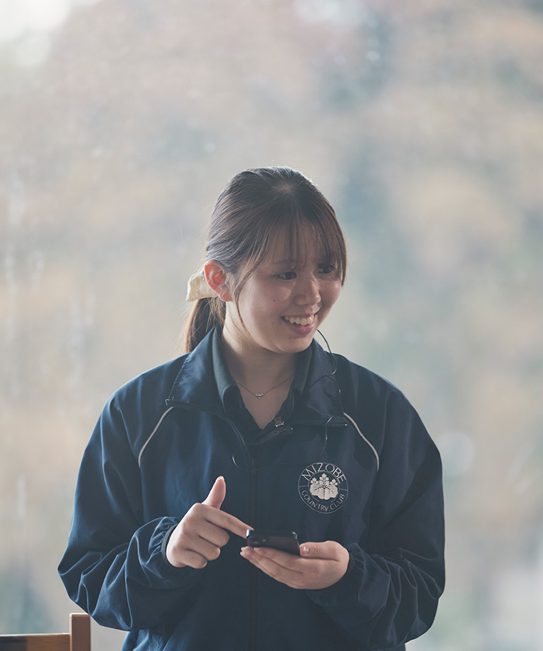 ゴルフ経験や知識がない人は、不安に思うかもしれませんが、私も全く無知の状態でのスタートでした。まわりの人たちが優しく丁寧に教えてくれるので、安心してください。何事もやってみなければわかりません。「接客が好き」という気持ちがあれば、きっと大丈夫。海外の方や県外の方、普段接することがないであろう方々と出会う機会が多くあり、感じることや学ぶこともたくさん。ゴルフを通していろんな価値観や文化に触れることもできます。大きな窓の外に広がる自然やグリーン、お客様のプレーを眺めるのも楽しみのひとつ。とても気持ちのいい職場ですよ。
